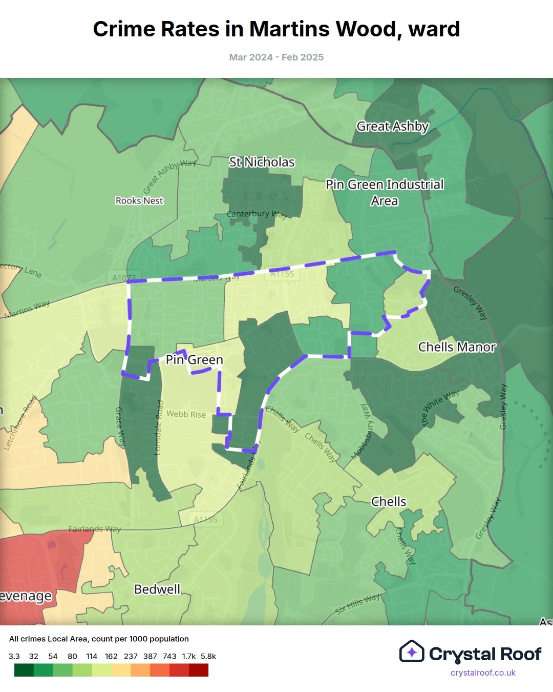 Martins Wood (ward) is located within Stevenage (borough). Annual total crime rate in Stevenage (borough) is 111 crimes per thousand resident population, which can be rated as 5 out of 10 or medium crime level compared to other local authority districts in England and Wales.