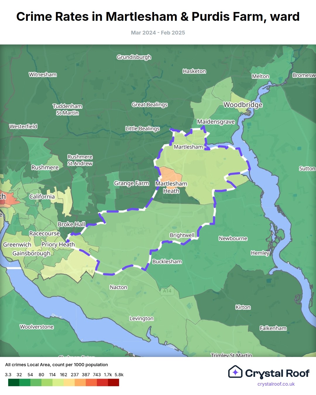 Martlesham & Purdis Farm, (ward) includes areas with the following crime ratings (see map):