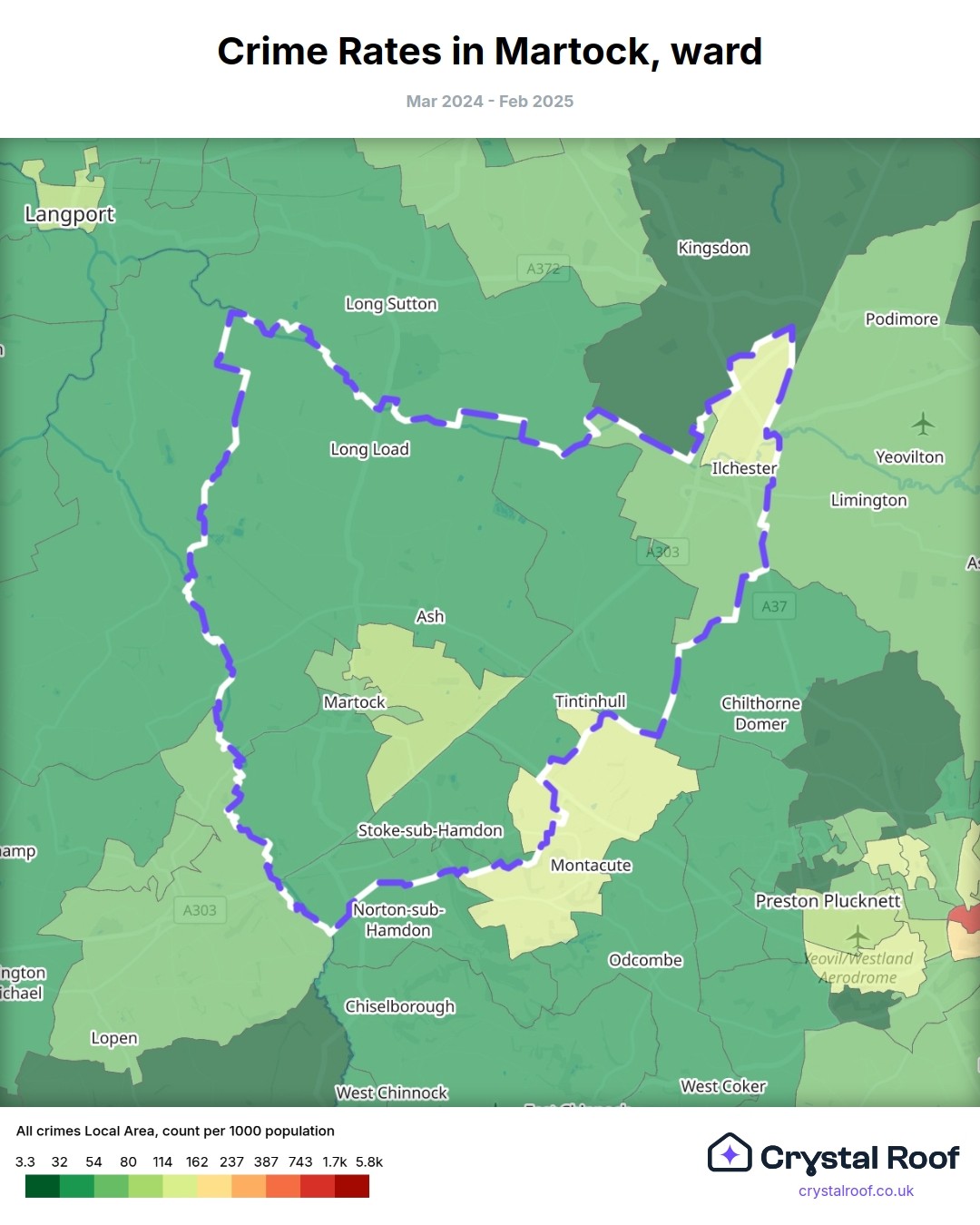 Martock, (ward) includes areas with the following crime ratings (see map):