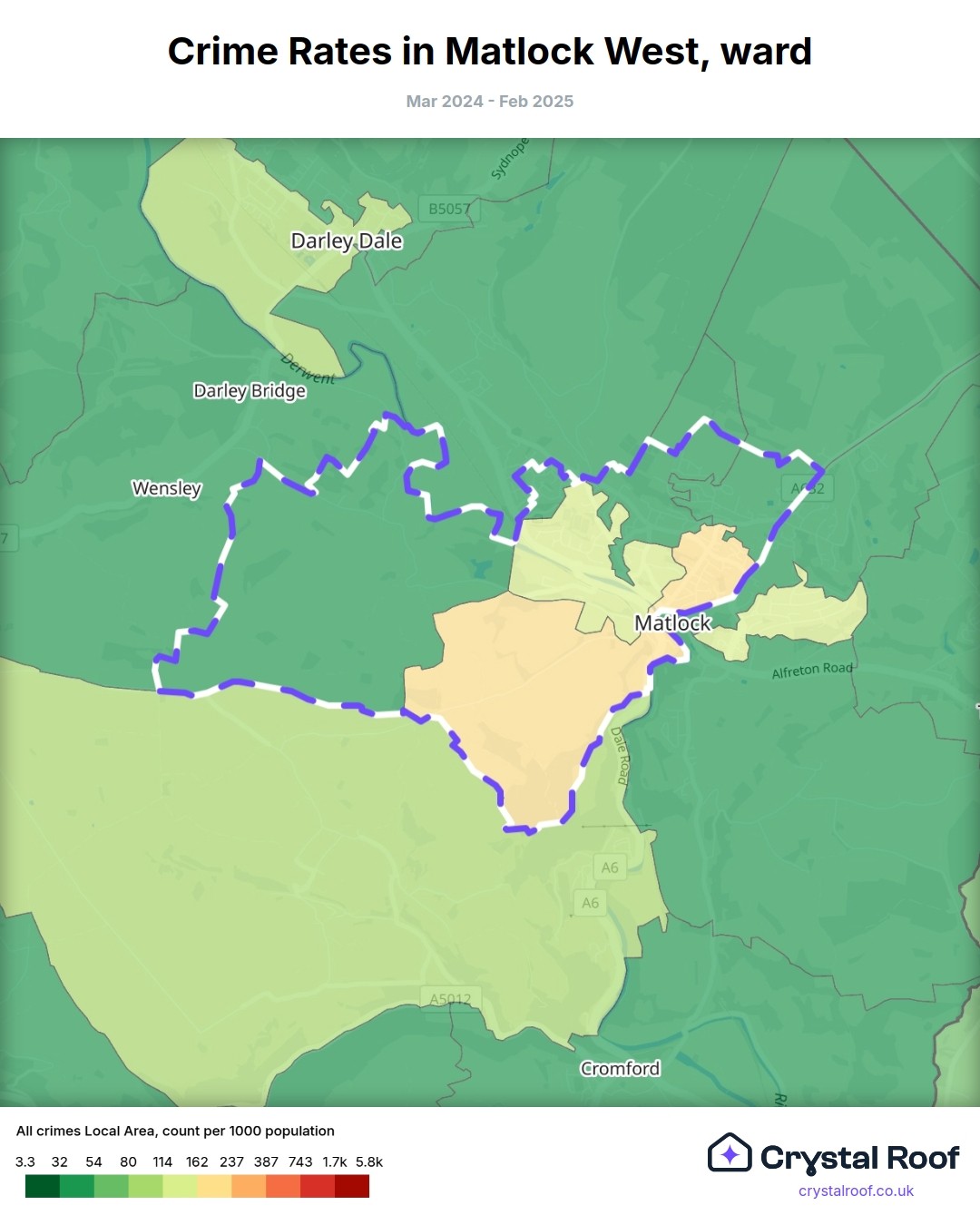 Matlock West, (ward) includes areas with the following crime ratings (see map):