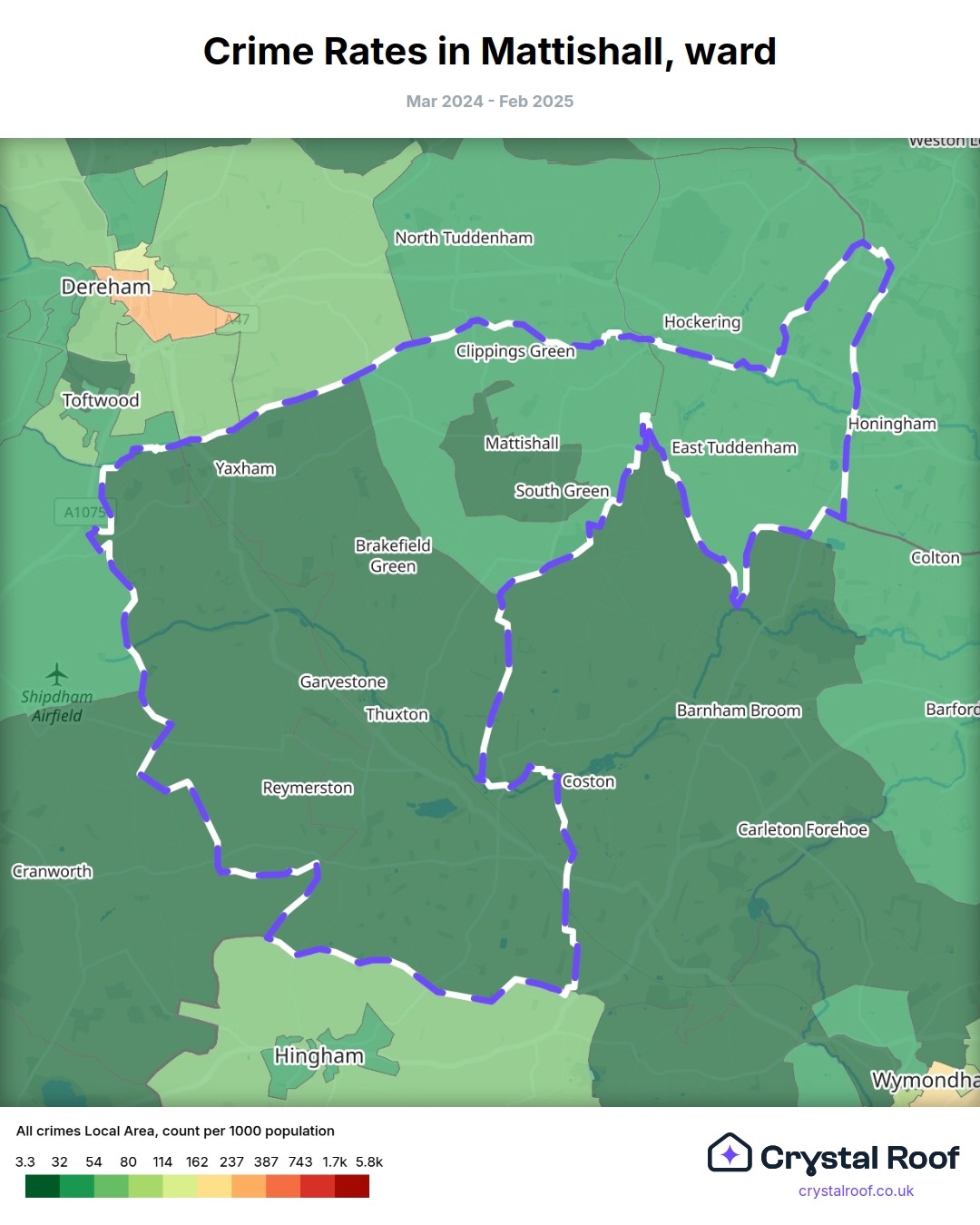 Mattishall, (ward) includes areas with the following crime ratings (see map):