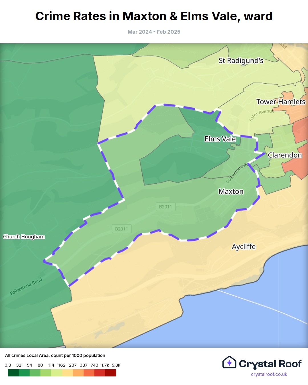 The figures in grey indicate the relative ratings of Maxton & Elms Vale (ward) for a specific crime type compared to other wards in England and Wales.