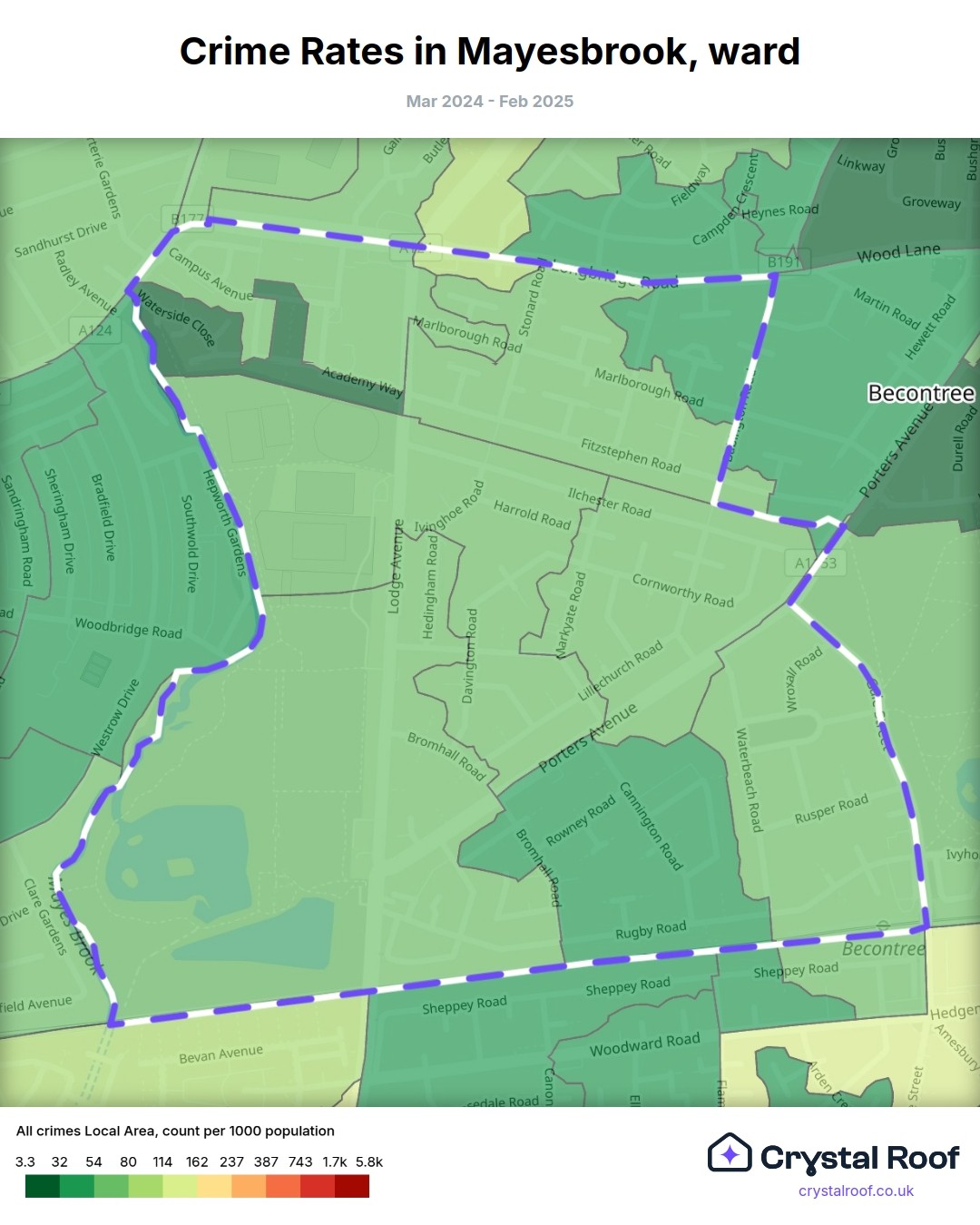 Mayesbrook (ward) is located within Barking and Dagenham (borough). Annual total crime rate in Barking and Dagenham (borough) is 111 crimes per thousand resident population, which can be rated as 5 out of 10 or medium crime level compared to other local authority districts in England and Wales.