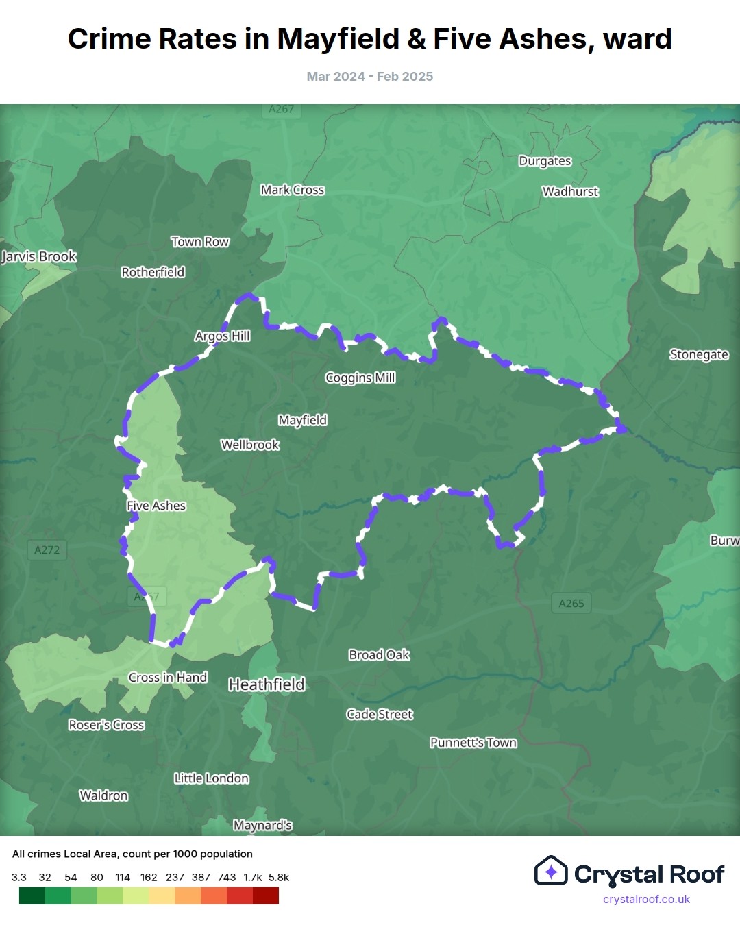 Mayfield & Five Ashes, (ward) includes areas with the following crime ratings (see map):