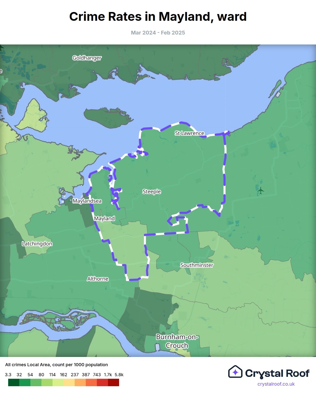 Mayland, (ward) includes areas with the following crime ratings (see map):