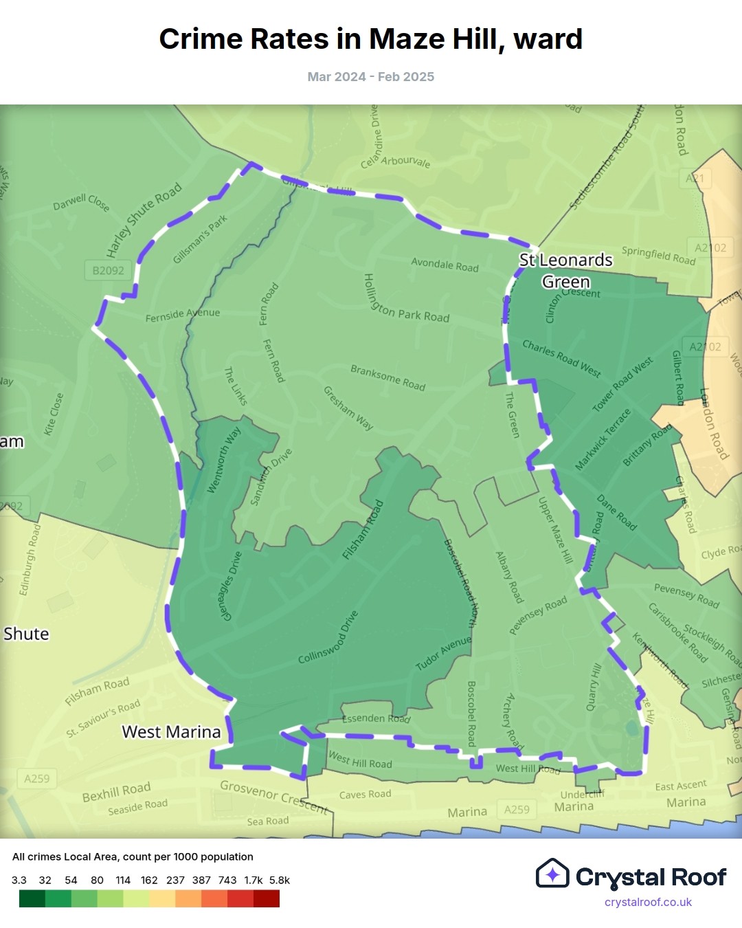 Maze Hill (ward) is located within Hastings (borough). Annual total crime rate in Hastings (borough) is 115 crimes per thousand resident population, which can be rated as 6 out of 10 or medium crime level compared to other local authority districts in England and Wales.