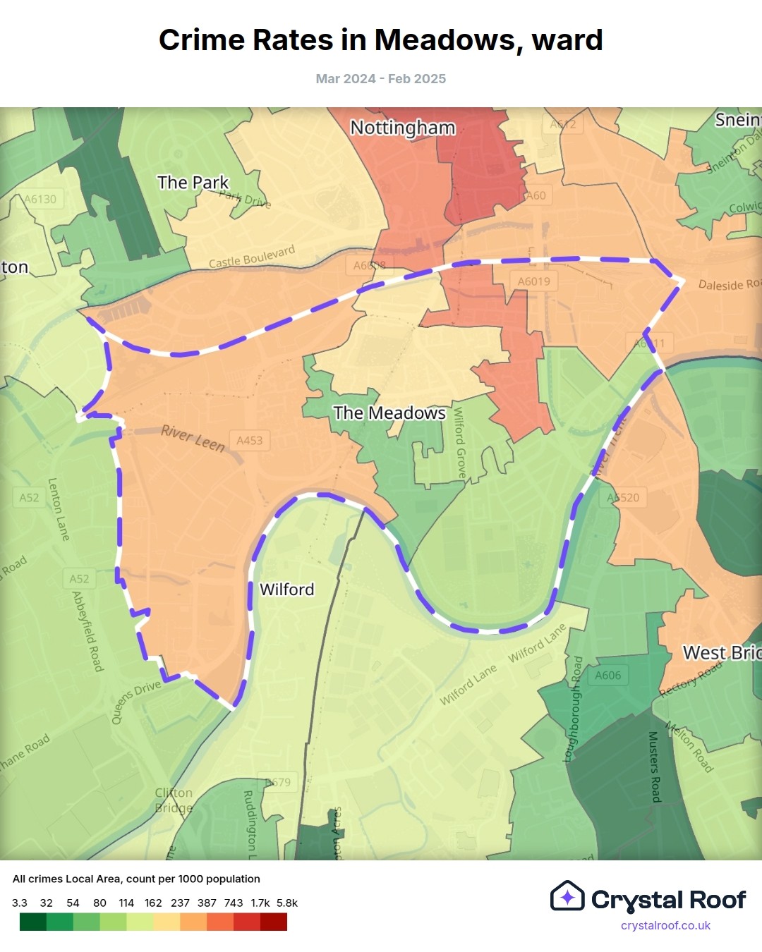 Meadows (ward) is located within Nottingham (borough). Annual total crime rate in Nottingham (borough) is 149 crimes per thousand resident population, which can be rated as 7 out of 10 or high crime level compared to other local authority districts in England and Wales.