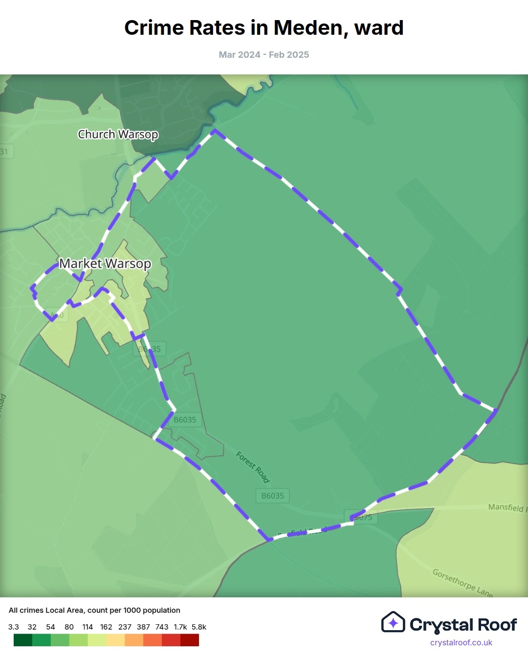 Meden (ward) is located within Mansfield (borough). Annual total crime rate in Mansfield (borough) is 115 crimes per thousand resident population, which can be rated as 6 out of 10 or medium crime level compared to other local authority districts in England and Wales.