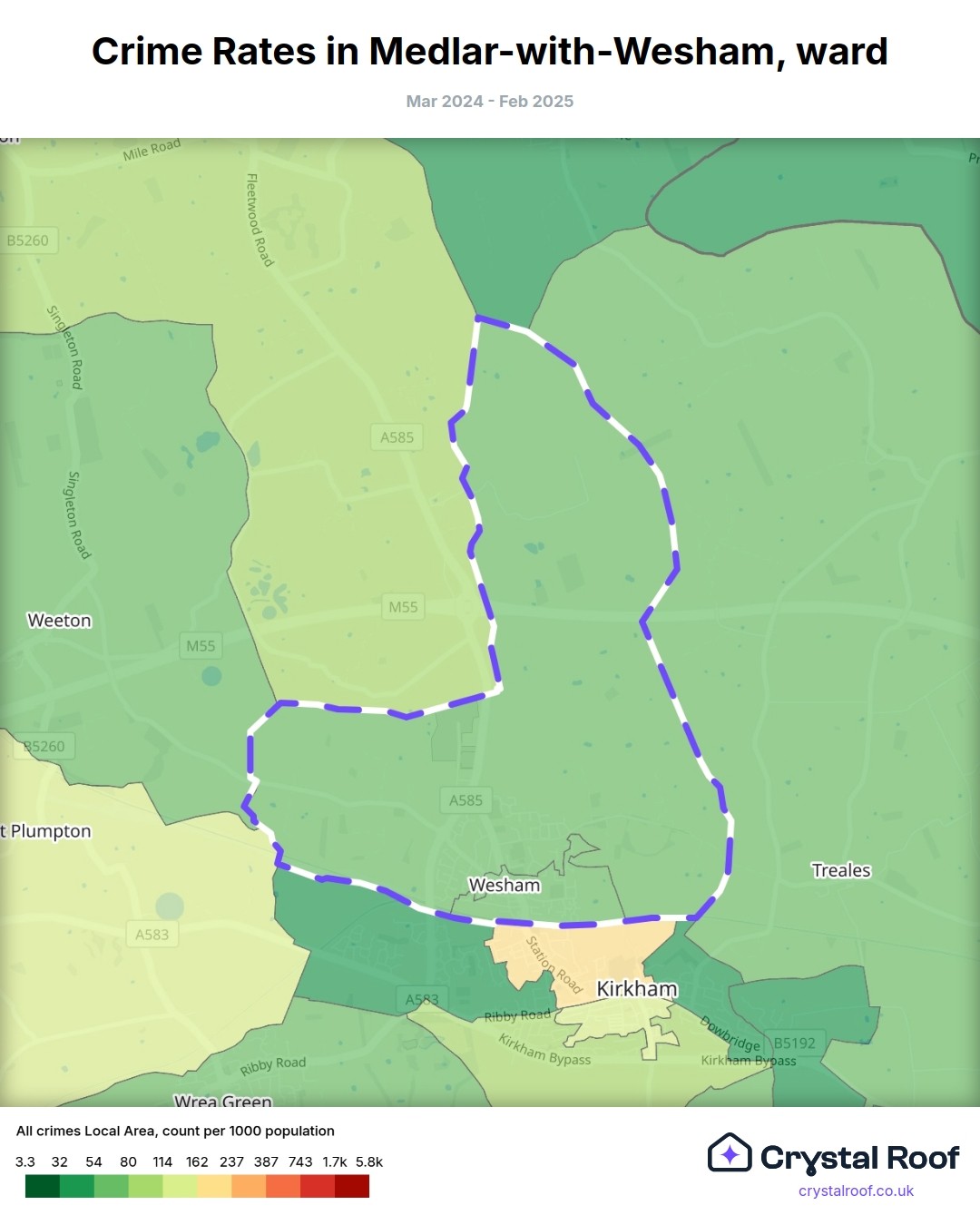 The figures in grey indicate the relative ratings of Medlar-with-Wesham (ward) for a specific crime type compared to other wards in England and Wales.