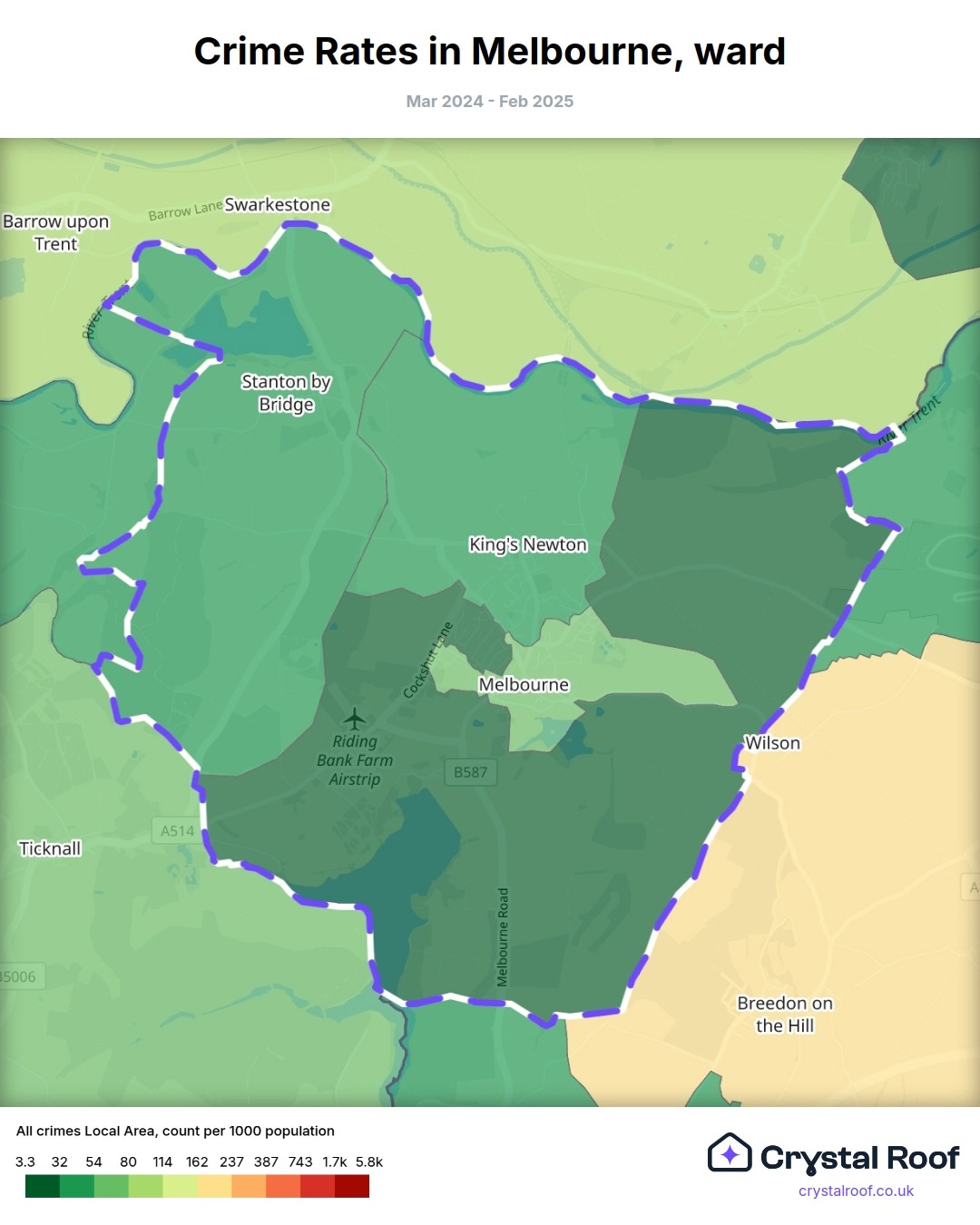 Annual total crime rate in Melbourne (ward) is 45.1 per thousand resident population. This can be rated as 2 out of 10 or low crime level compared to other wards in England and Wales.