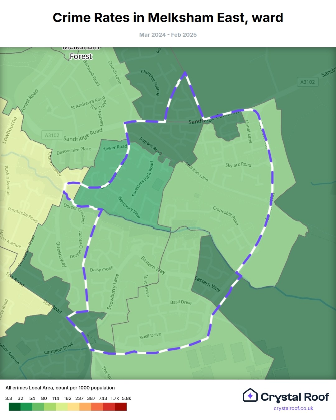 Melksham East, (ward) includes areas with the following crime ratings (see map):