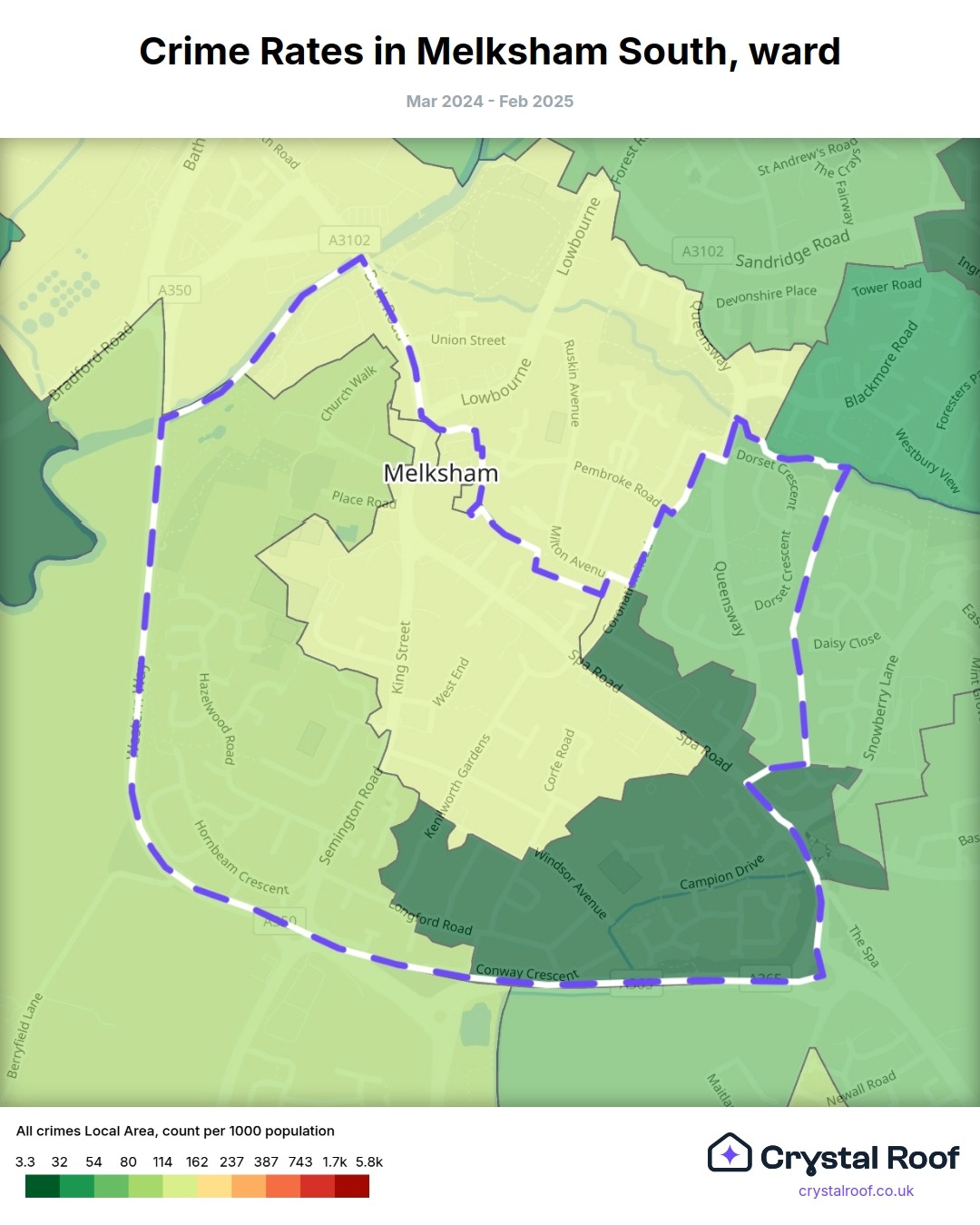 Melksham South, (ward) includes areas with the following crime ratings (see map):