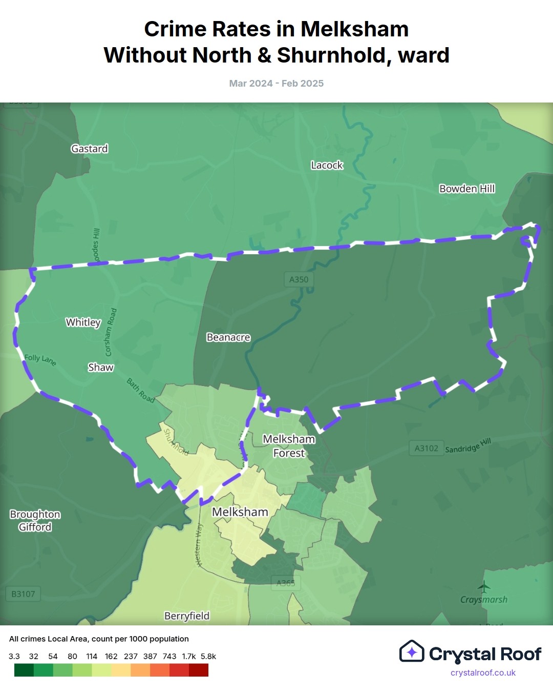 Melksham Without North & Shurnhold, (ward) includes areas with the following crime ratings (see map):