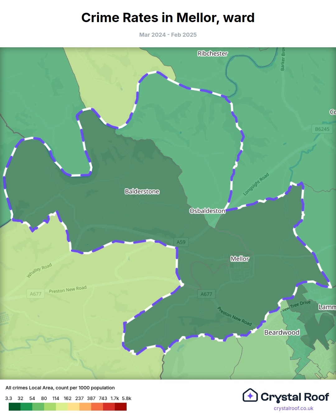 Mellor, (ward) includes areas with the following crime ratings (see map):