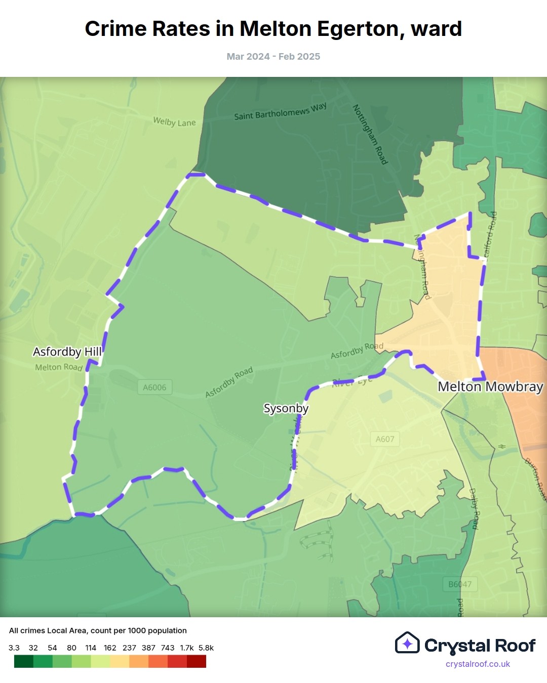 Melton Egerton, (ward) includes areas with the following crime ratings (see map):