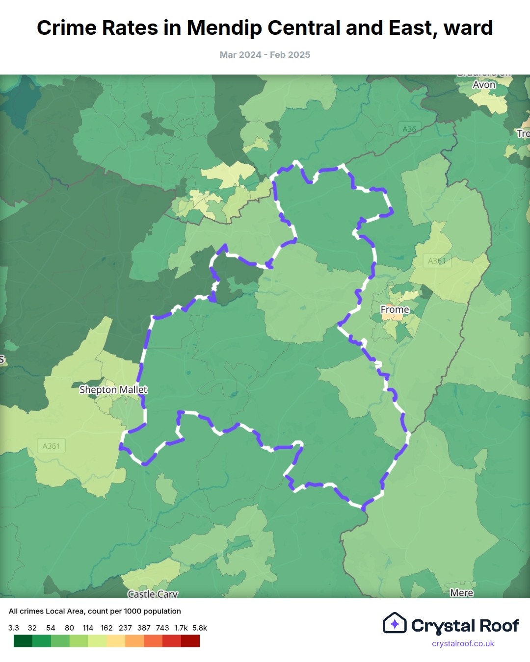 Mendip Central and East, (ward) includes areas with the following crime ratings (see map):