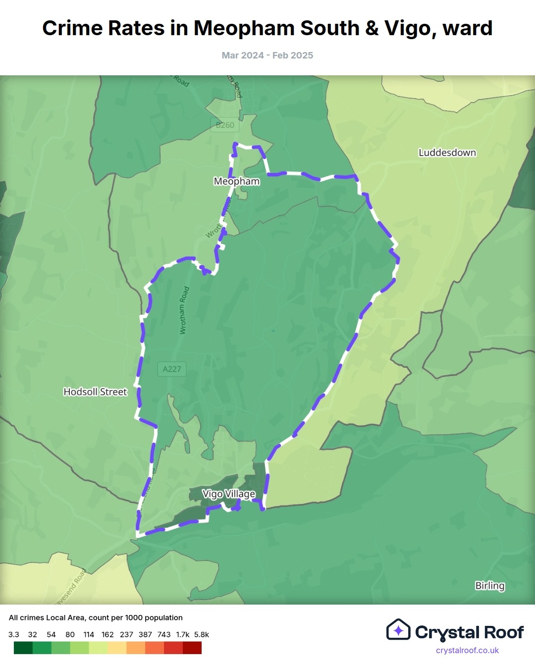 Meopham South & Vigo, (ward) includes areas with the following crime ratings (see map):