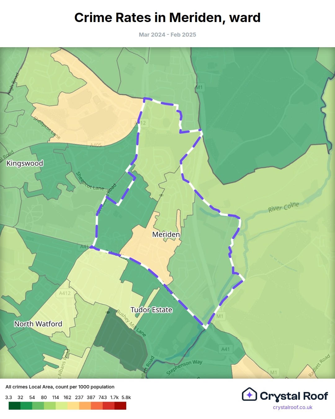 Meriden (ward) is located within Watford (borough). Annual total crime rate in Watford (borough) is 113 crimes per thousand resident population, which can be rated as 5 out of 10 or medium crime level compared to other local authority districts in England and Wales.