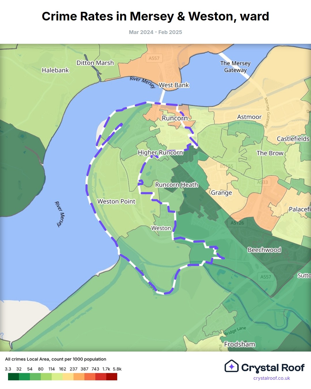 Mersey & Weston, (ward) includes areas with the following crime ratings (see map):