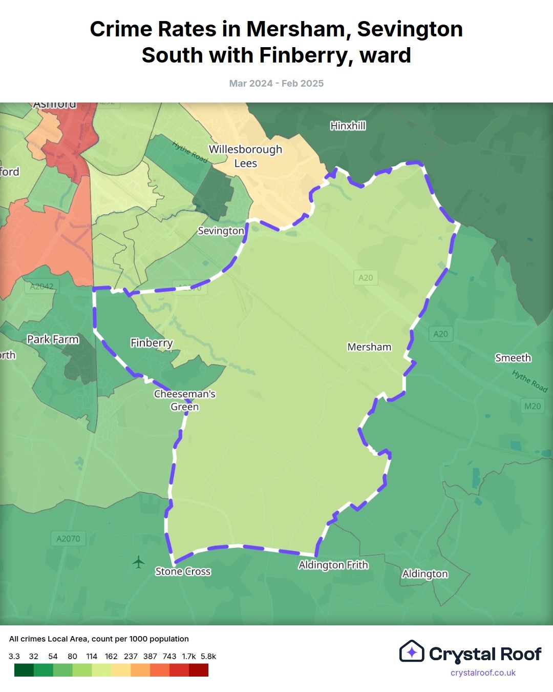 Mersham, Sevington South with Finberry, (ward) includes areas with the following crime ratings (see map):