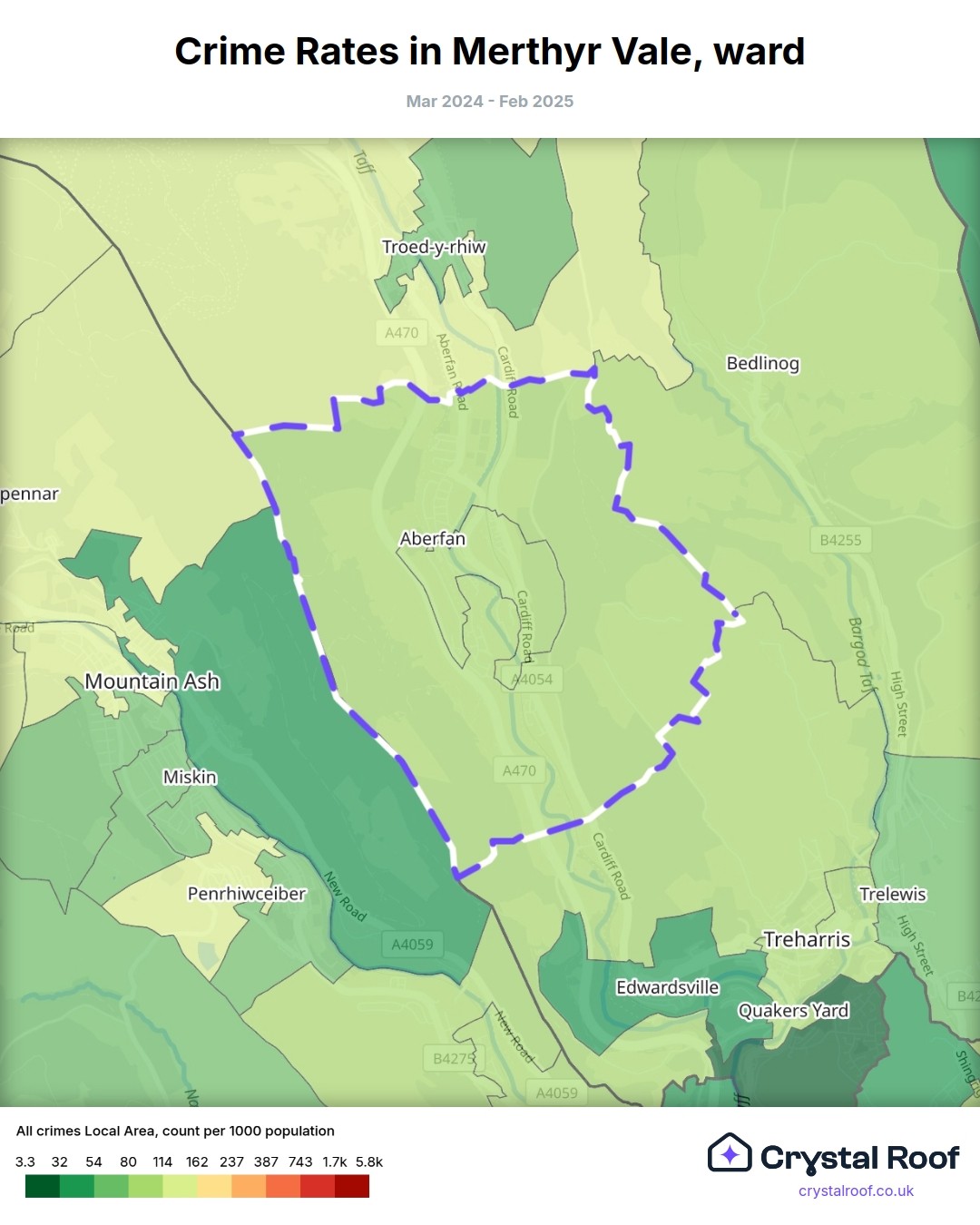 Merthyr Vale, (ward) includes areas with the following crime ratings (see map):