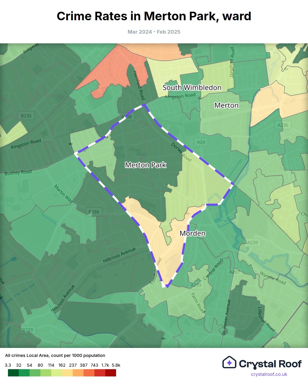 Merton Park, (ward) includes areas with the following crime ratings (see map):