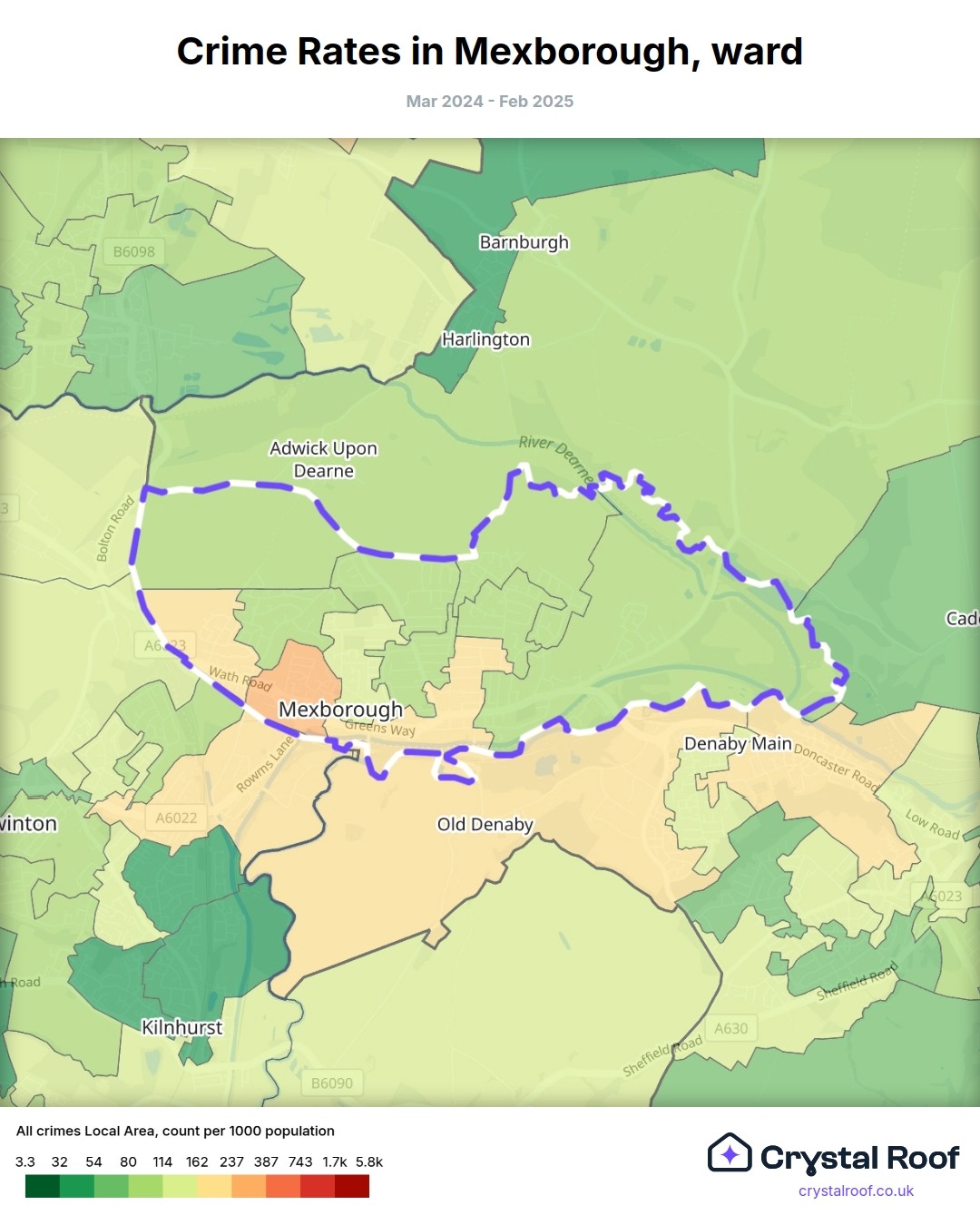 The figures in grey indicate the relative ratings of Mexborough (ward) for a specific crime type compared to other wards in England and Wales.