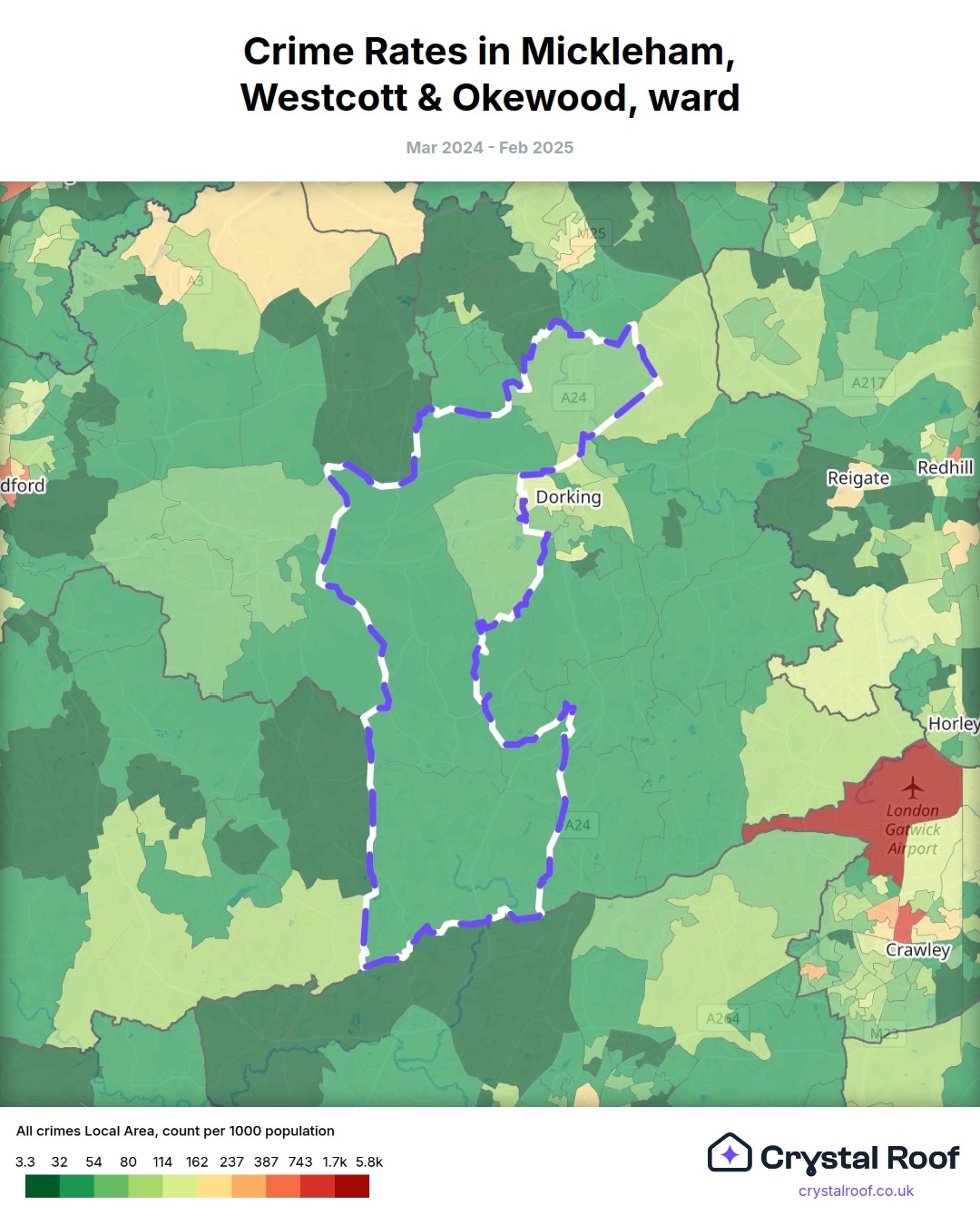 Mickleham, Westcott & Okewood, (ward) includes areas with the following crime ratings (see map):