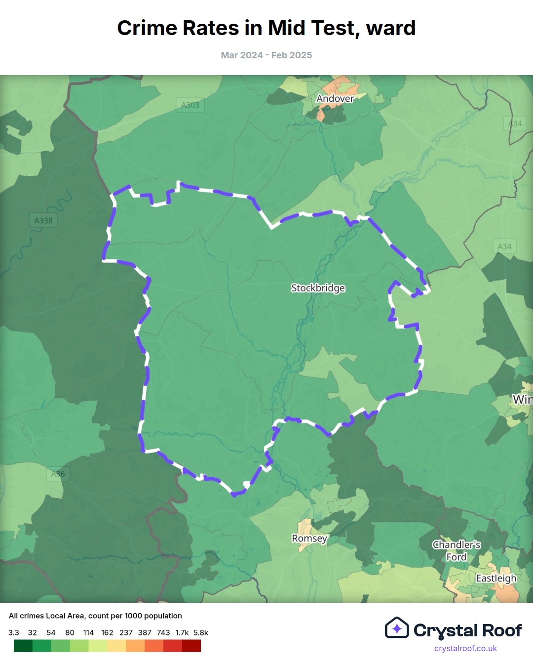 Annual total crime rate in Mid Test (ward) is 47.2 per thousand resident population. This can be rated as 2 out of 10 or low crime level compared to other wards in England and Wales.