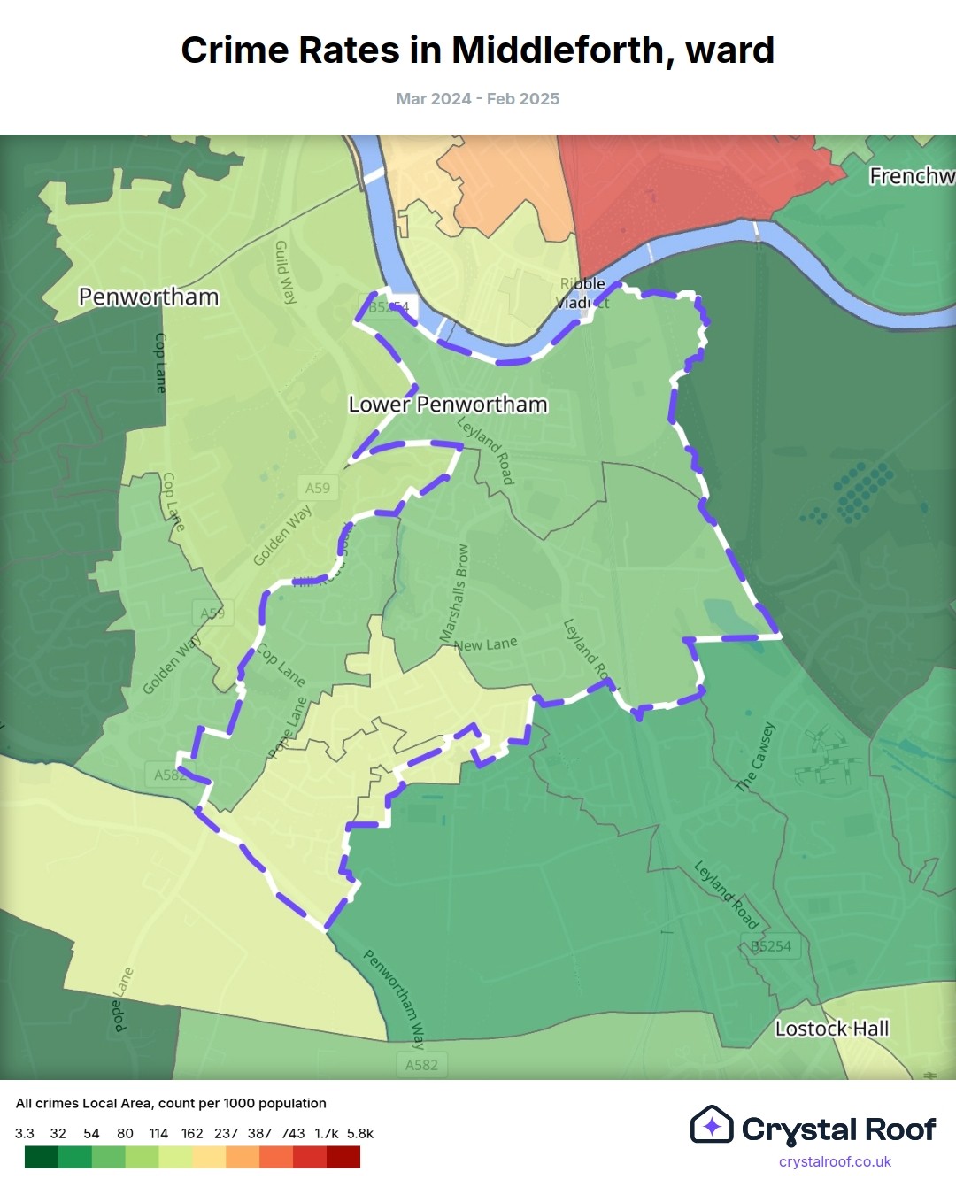 The figures in grey indicate the relative ratings of Middleforth (ward) for a specific crime type compared to other wards in England and Wales.