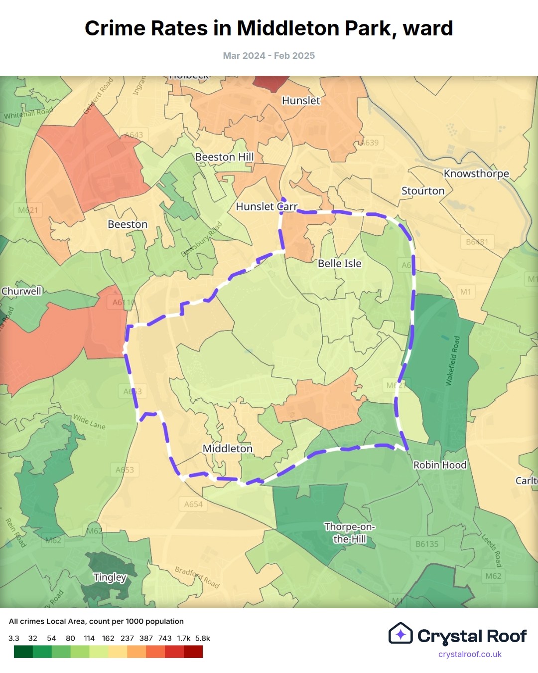 Middleton Park (ward) is located within Leeds (borough). Annual total crime rate in Leeds (borough) is 135 crimes per thousand resident population, which can be rated as 7 out of 10 or high crime level compared to other local authority districts in England and Wales.