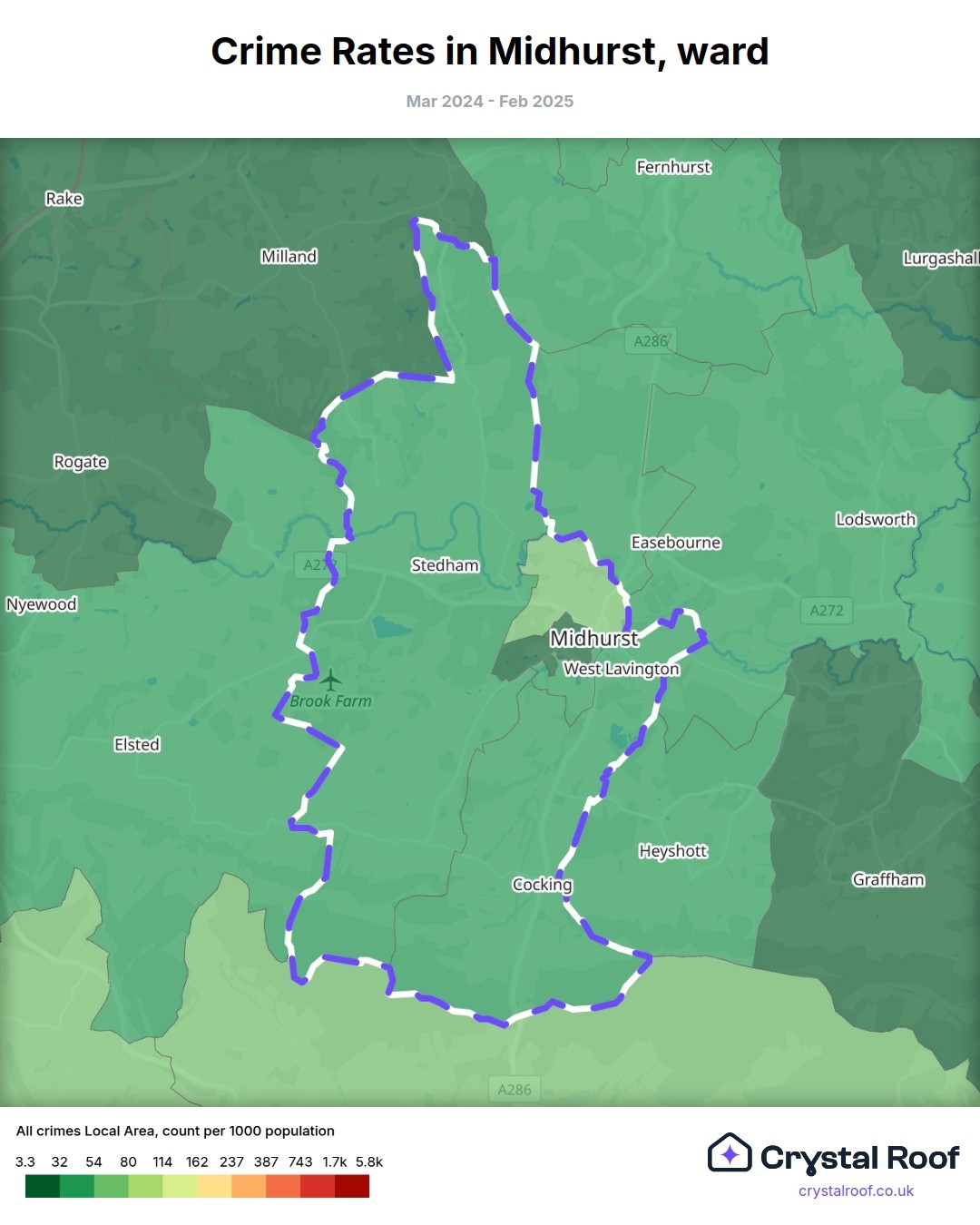 Midhurst, (ward) includes areas with the following crime ratings (see map):
