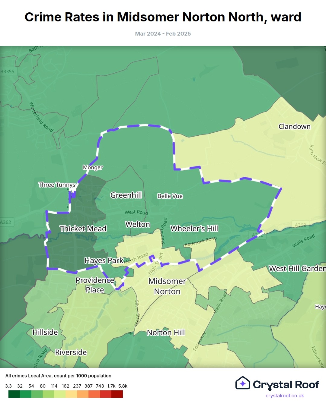 Midsomer Norton North, (ward) includes areas with the following crime ratings (see map):
