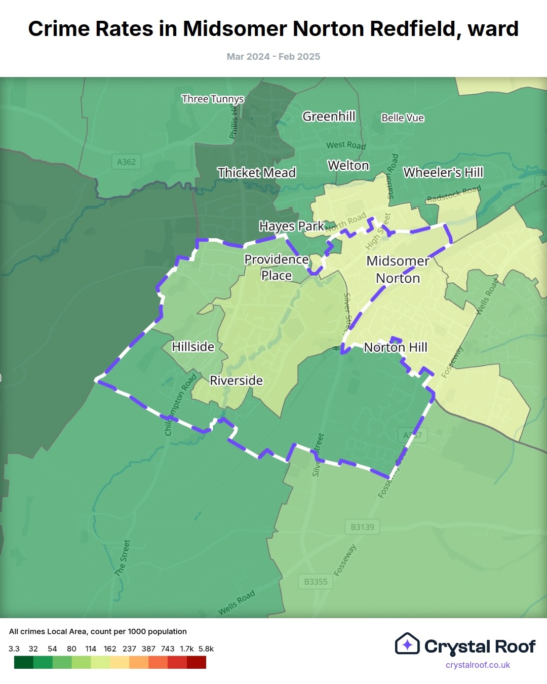 Midsomer Norton Redfield, (ward) includes areas with the following crime ratings (see map):