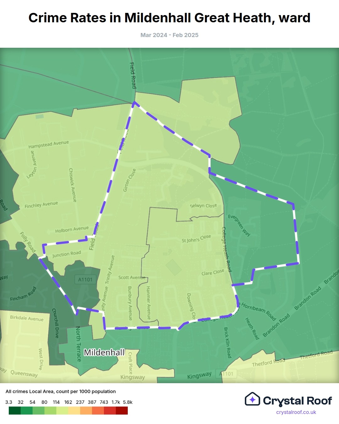 Mildenhall Great Heath, (ward) includes areas with the following crime ratings (see map):