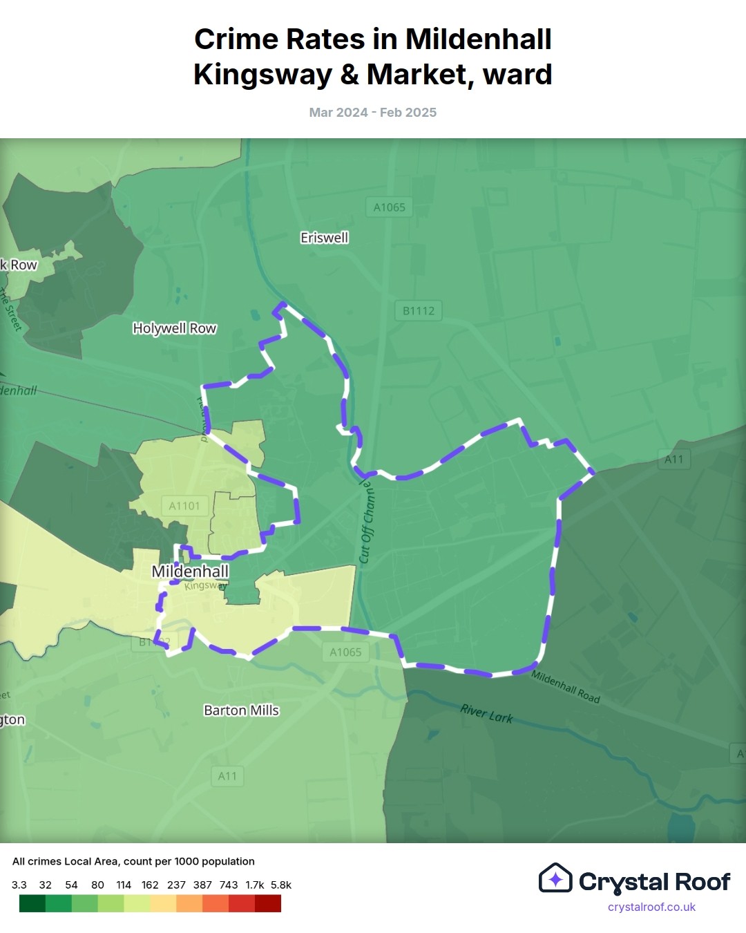 Mildenhall Kingsway & Market, (ward) includes areas with the following crime ratings (see map):