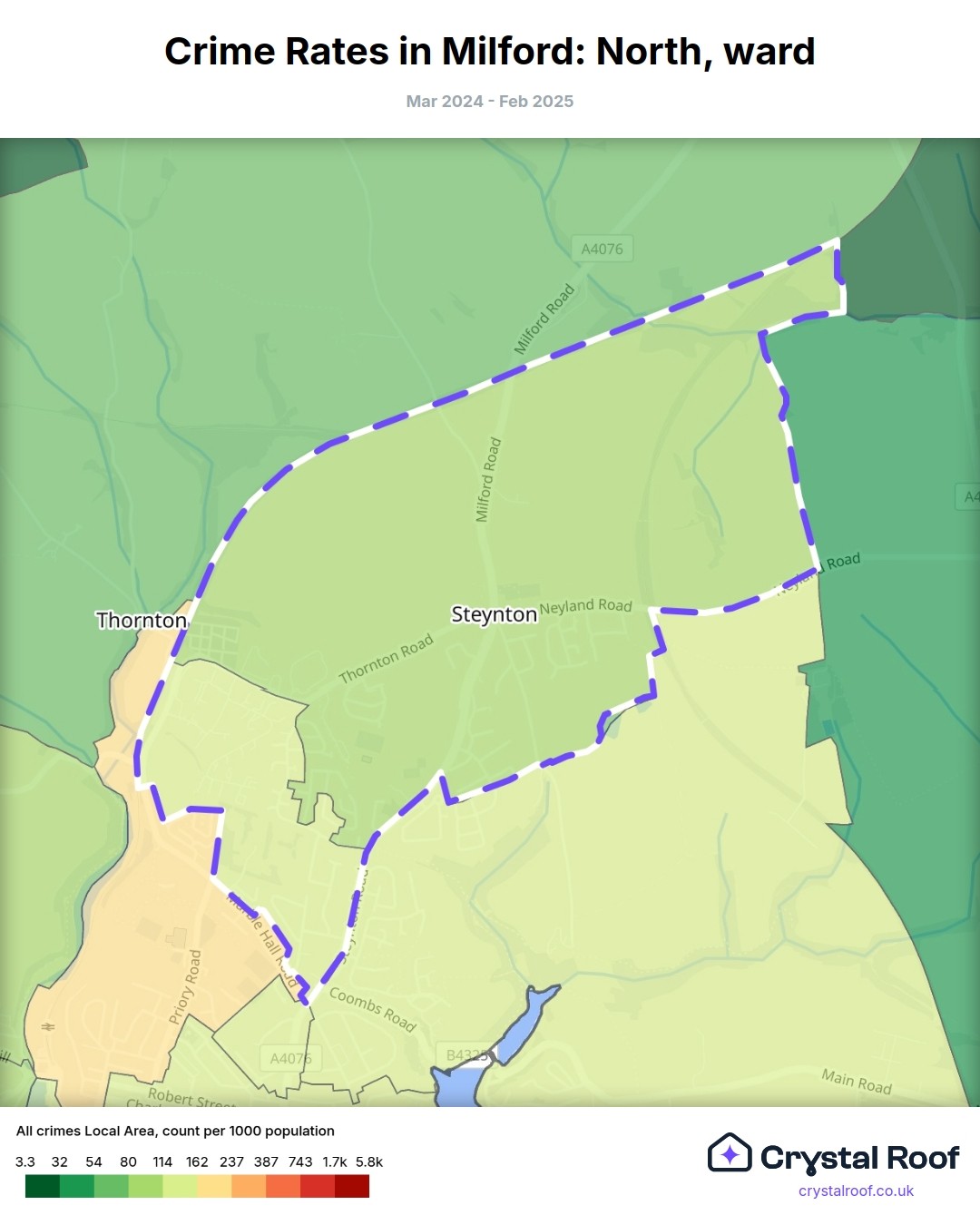 Milford: North, (ward) includes areas with the following crime ratings (see map):