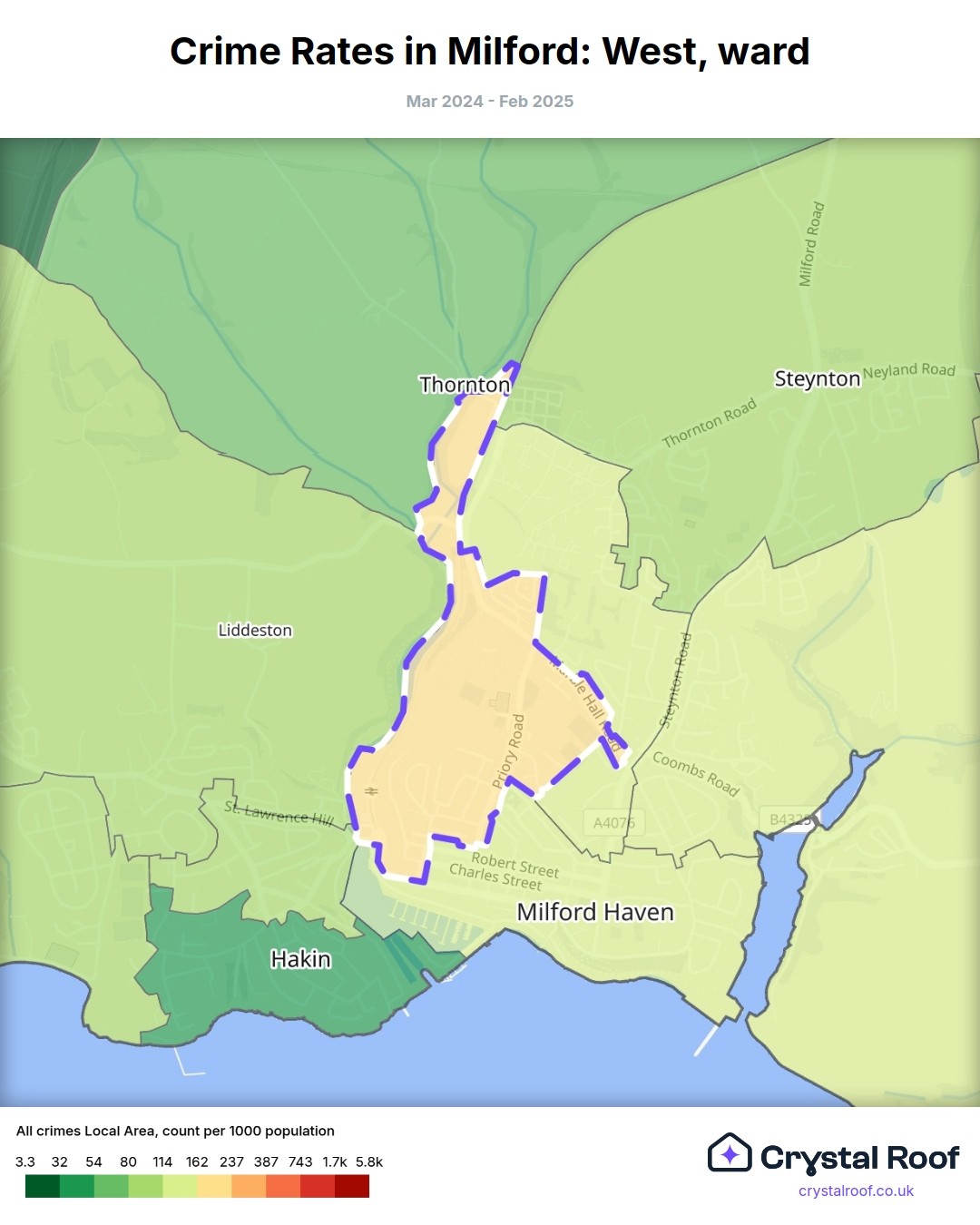 Milford: West, (ward) includes areas with the following crime ratings (see map):