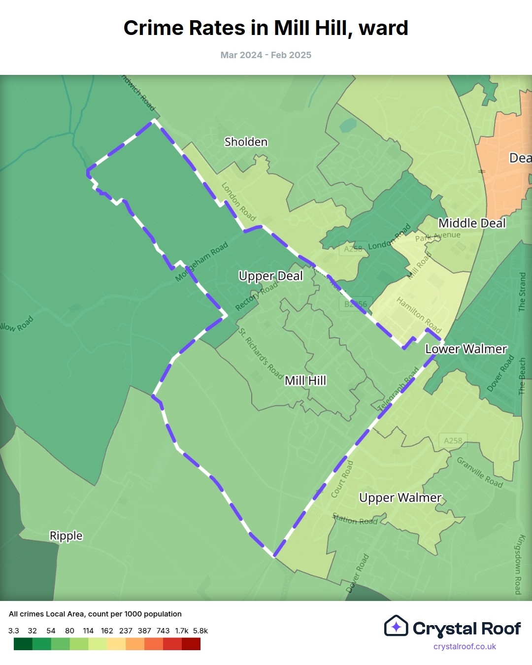 Mill Hill (ward) is located within Dover (borough). Annual total crime rate in Dover (borough) is 94.3 crimes per thousand resident population, which can be rated as 4 out of 10 or low crime level compared to other local authority districts in England and Wales.