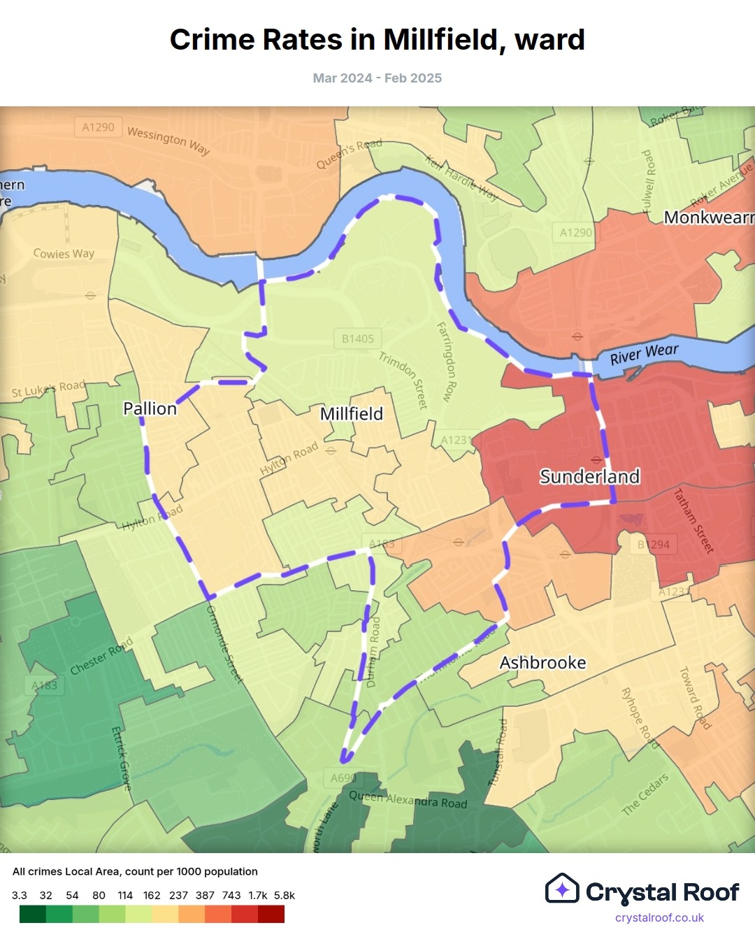 Millfield (ward) is located within Sunderland (borough). Annual total crime rate in Sunderland (borough) is 122 crimes per thousand resident population, which can be rated as 6 out of 10 or medium crime level compared to other local authority districts in England and Wales.
