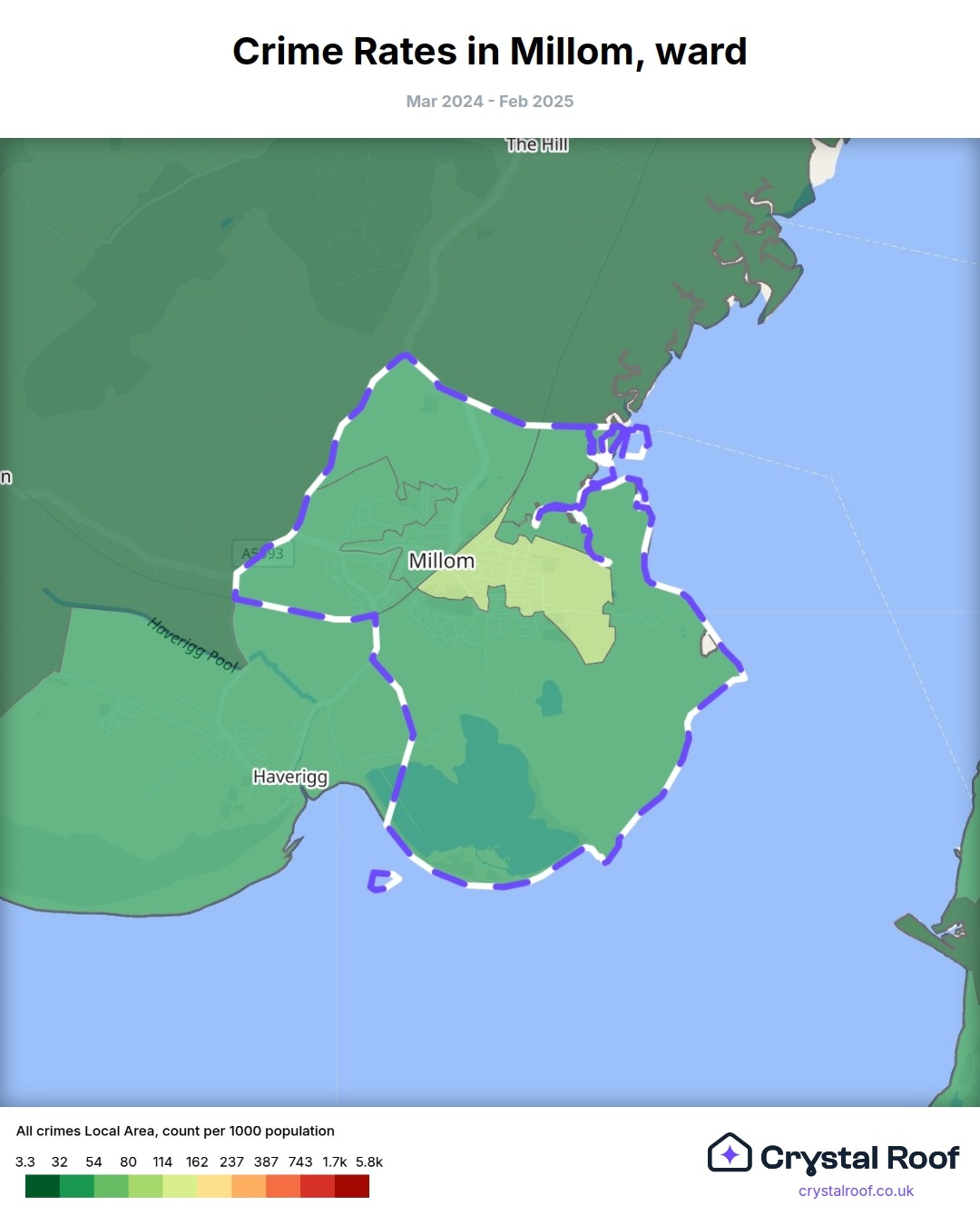 The figures in grey indicate the relative ratings of Millom (ward) for a specific crime type compared to other wards in England and Wales.