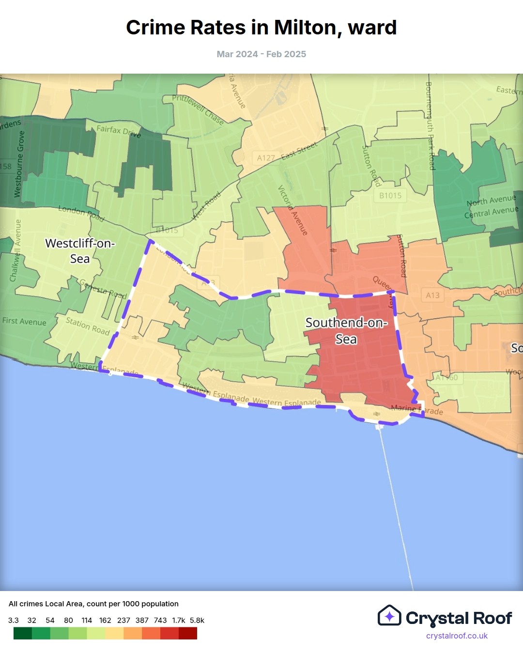 Milton (ward) is located within Southend-on-Sea (borough). Annual total crime rate in Southend-on-Sea (borough) is 109 crimes per thousand resident population, which can be rated as 5 out of 10 or medium crime level compared to other local authority districts in England and Wales.