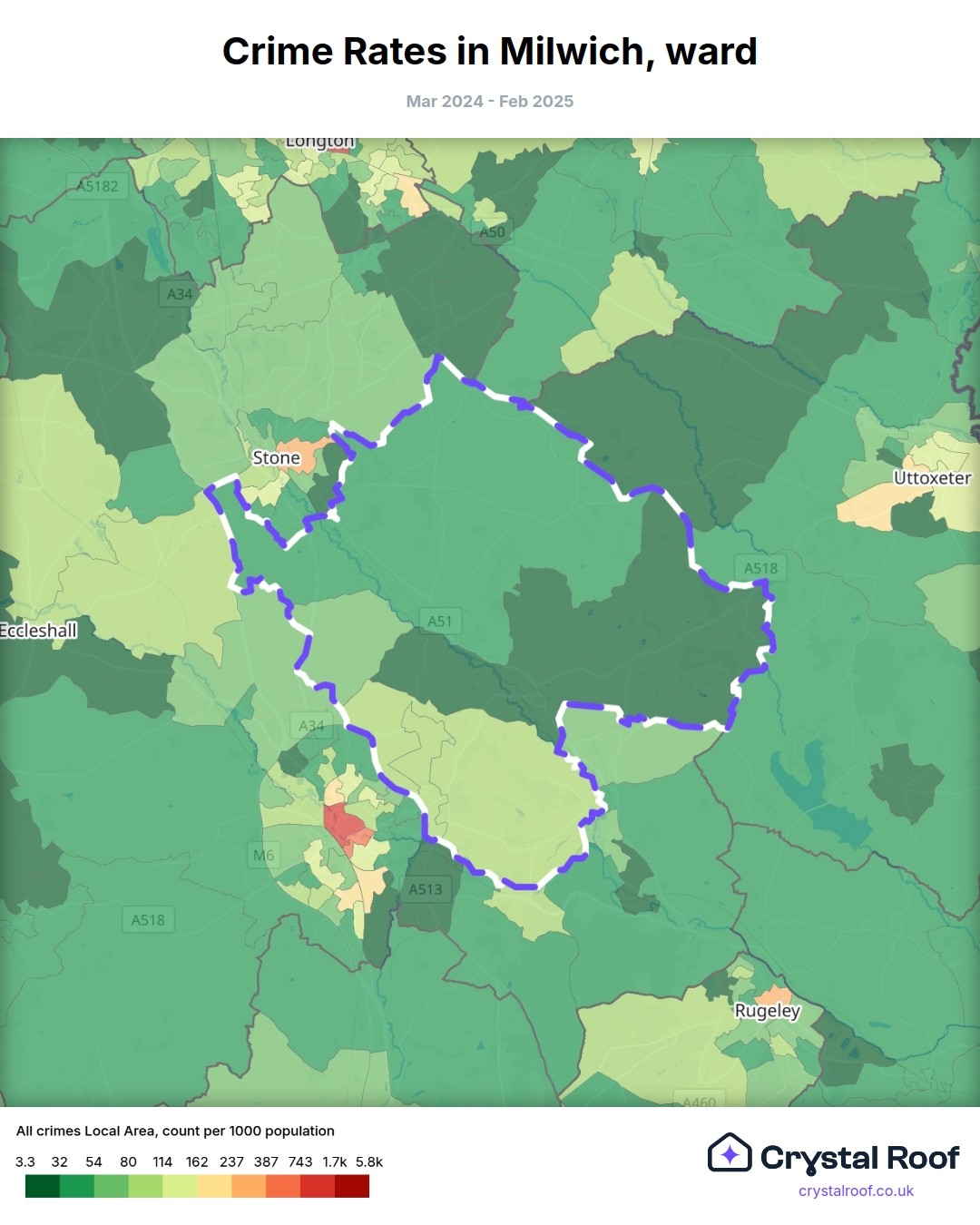 The figures in grey indicate the relative ratings of Milwich (ward) for a specific crime type compared to other wards in England and Wales.