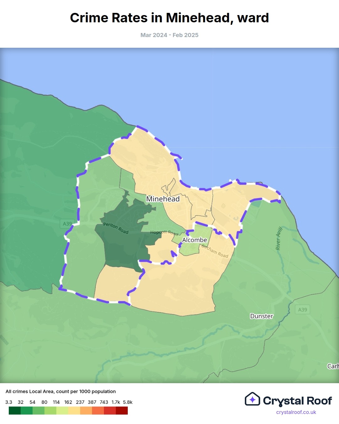Minehead, (ward) includes areas with the following crime ratings (see map):