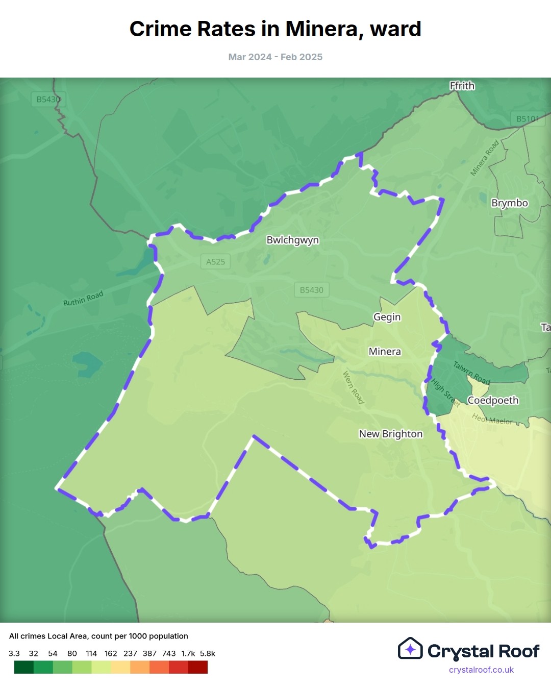 The figures in grey indicate the relative ratings of Minera (ward) for a specific crime type compared to other wards in England and Wales.