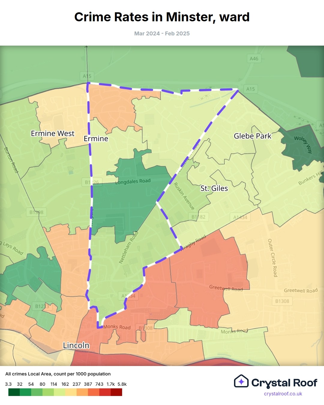 Minster (ward) is located within Lincoln (borough). Annual total crime rate in Lincoln (borough) is 158 crimes per thousand resident population, which can be rated as 7 out of 10 or high crime level compared to other local authority districts in England and Wales.