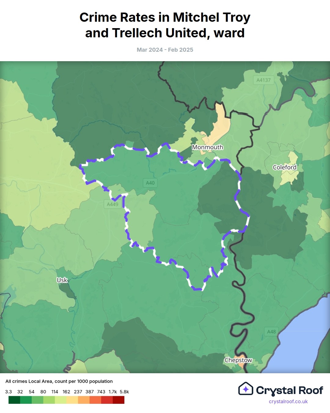 Mitchel Troy and Trellech United, (ward) includes areas with the following crime ratings (see map):