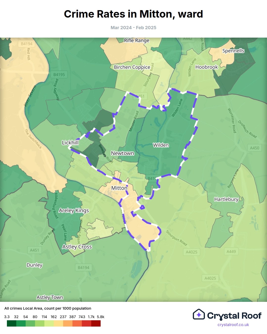 Mitton (ward) is located within Wyre Forest (borough). Annual total crime rate in Wyre Forest (borough) is 94.7 crimes per thousand resident population, which can be rated as 4 out of 10 or low crime level compared to other local authority districts in England and Wales.