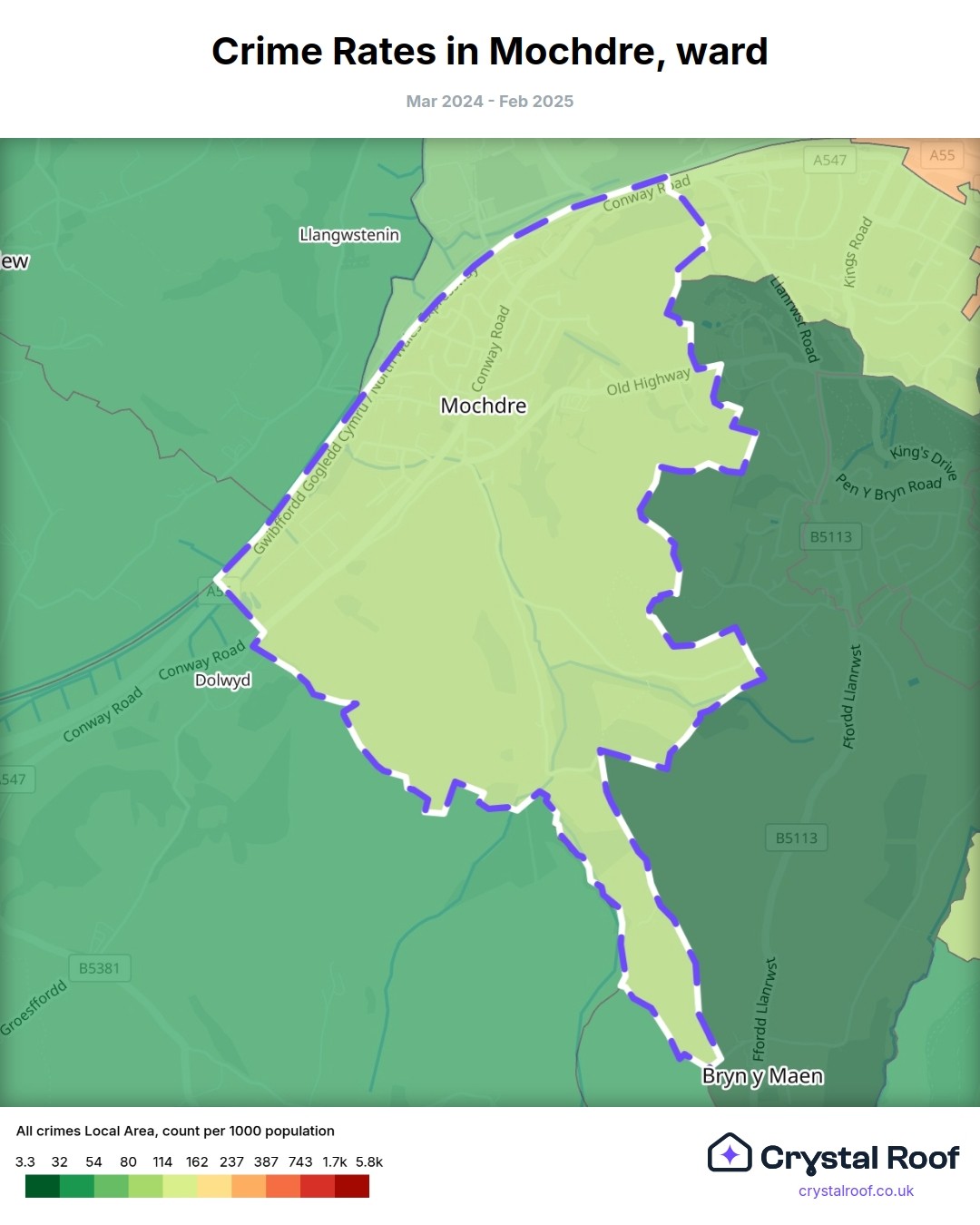 Mochdre, (ward) includes areas with the following crime ratings (see map):