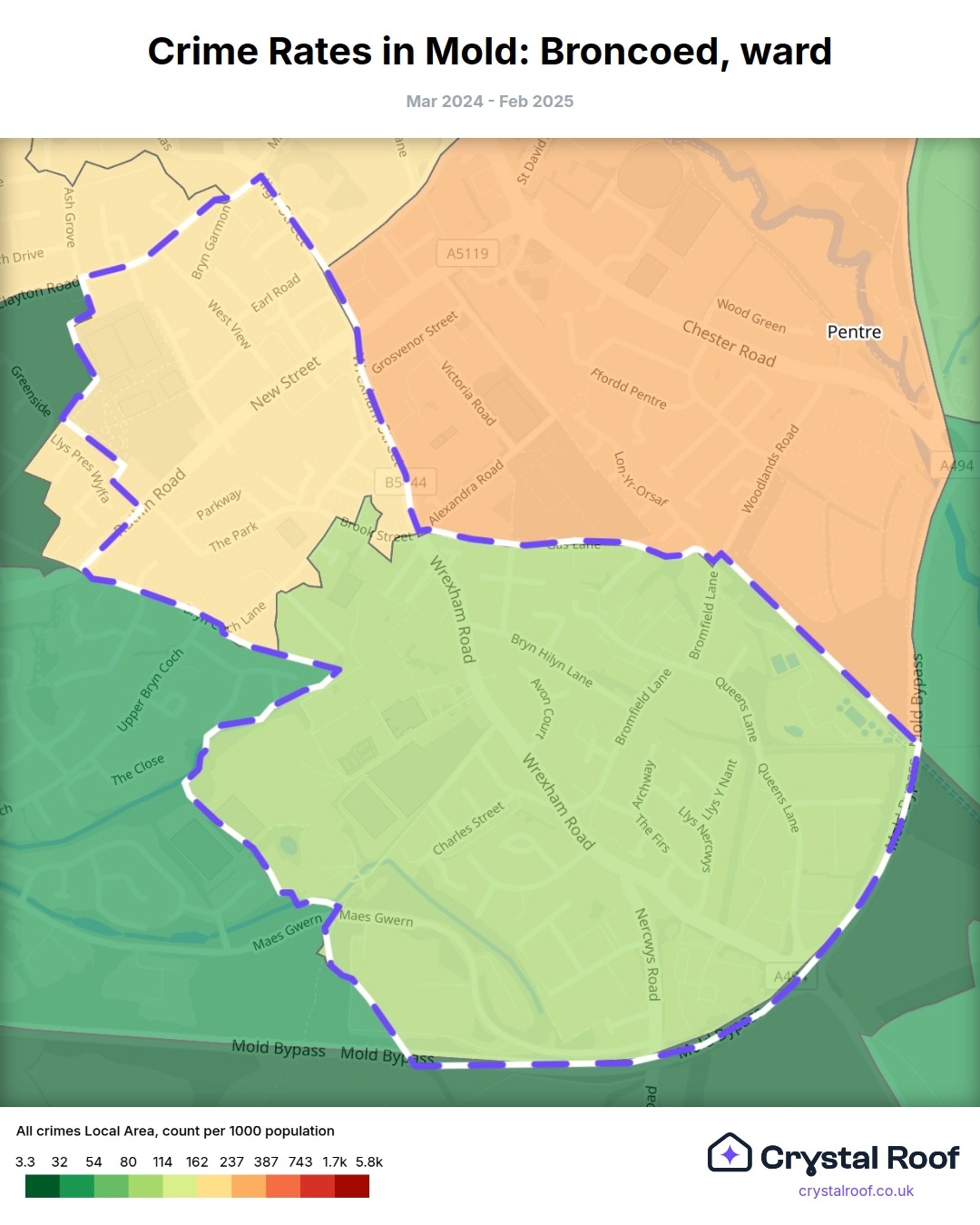 Mold: Broncoed, (ward) includes areas with the following crime ratings (see map):